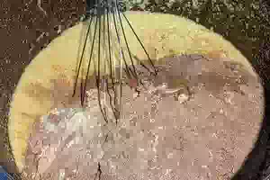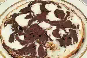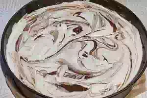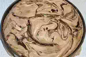 3. Застилаем дно формы диаметром 28 см (можно выпекать коржи в двух небольших формах) бумагой и двумя ложками (одна для белого, другая для шоколадного теста) выкладываем по очереди тесто в форму. Затем вилкой рисуем по тесту спираль и пару восьмёрок, чтобы коржи получились с двухцветным «мраморным» рисунком.