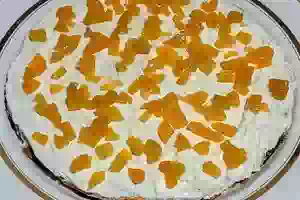 6. Готовим крем для торта. Взбиваем холодные сливки с сахарной пудрой и ванильным сахаром. Постепенно, маленькими порциями добавляем сыр маскарпоне. Оставляем немного крема для обмазки торта, а в остальной вводим йогурт. Каждый корж пропитываем жидкостью из-под консервированных абрикосов. Можно добавить в сироп ложку коньяка. Смазываем корж кремом, выкладываем кубики абрикосов. И так оформляем два коржа. Накрываем коржи с кремом и кусочками абрикосов третьим коржом.