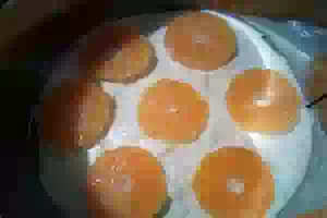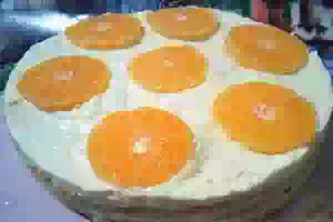 13. Дальше повторите еще два раза чередование пропитанных сиропом коржей и крема (верхний корж должен быть покрыть кремом). Верх апельсинового торта украсьте кружочками апельсина или мандарина. Отправьте апельсиновый торт в холодильник на 4-6 часов.