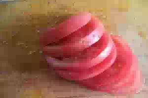 8. Помидоры вымыть, нарезать кружками толщиной около 0,5 см.
