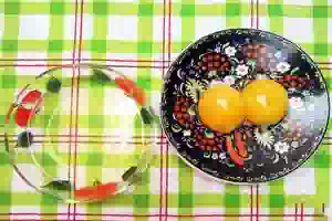 5. В посуду к взбитым белкам добавляем желтки, бананы, сливки и растительное масло.