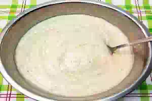 8. Все аккуратно перемешиваем (можно на слабых оборотах миксера). Тесто по консистенции должно напоминать густую сметану.