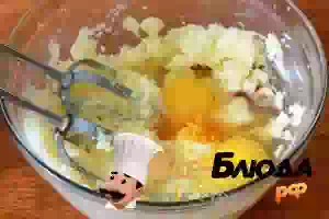 1. Размягченное сливочное масло взбиваем с сахаром, добавляем яйца, ванилин, цедру. Взбиваем до однородной массы.