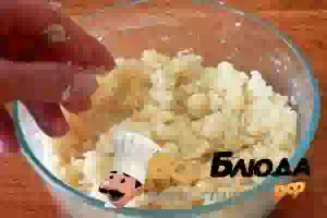 7. В отдельной тарелке готовим присыпку: смешиваем сахар, муку и сливочное масло. Растираем руками.
