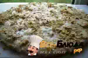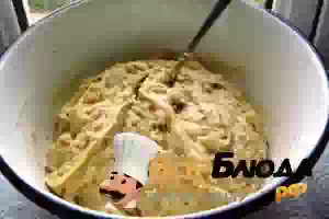 2. К полученной смеси добавляем соду, гашенную лимонным соком, ванилин и муку, перемешиваем до однородной массы. Добавляем измельченные орехи и снова перемешиваем. Тесто должно получиться мягким и пышным, похожим на густую сметану.