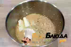 6. Всыпьте арахисовую крошку и добавьте мягкое сливочное масло, нарезанное кубиками.