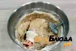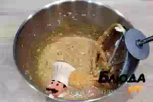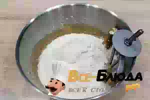 8. Всыпьте разом всю муку (500 г), просеянную с разрыхлителем.
