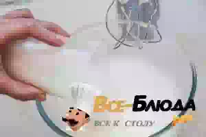 2. Для коржей взбить яичные белки до мягкой воздушной пены. Продолжая взбивать белки, добавить сахар - сначала около трети, затем весь оставшийся. Взбивать до появления устойчивых пиков.