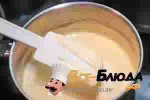 5. Для крема смешать растереть яичные желтки с сахаром. Молоко довести до кипения и вылить тонкой струйкой в желтки с сахаром, не забывая постоянно помешивать. Миску с кремом поставить на водяную баню и варить до загустения, постоянно помешивая. Готовность крема проверить, проведя пальцем по лопатке с кремом – должен оставаться четкий след. Когда крем загустеет, дайте ему остыть немного, прикрыв емкость с кремом пленкой, и добавить понемногу холодное масло. Взбить до получения однородной массы и оставить в холодильнике, пока не затвердеет.