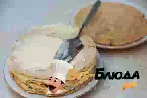 6. Коржи промазать кремом и сложить стопочкой. Для украшения измельчить грецкие орехи. Бока и верх торта смазать кремом и посыпать ореховой крошкой. Убрать в холодильник на ночь.