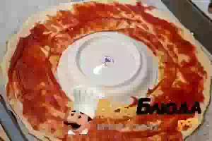 2. Переложить раскатанное тесто на противень, застеленный пекарской бумагой и смазанный растительным маслом. В центр лепешки положить тарелку диаметром 10-12 см. Смазать тесто кетчупом, оставляя свободными края (примерно по 1 см). Посыпать сушеным орегано.