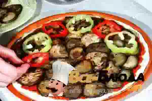 3. Лепешки смазать томатным соусом и выложить на них баклажаны. Раскладывая баклажаны, старайтесь накладывать кружки один на другой, как черепицу. Перцы промыть, срезать плодоножку, удалить семена. Нарезать перцы кольцами и разложить поверх баклажанов.