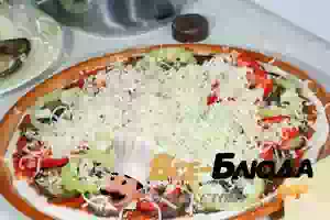 4. Тертым сыром обильно посыпьте пиццу и отправляйте форму с пиццей в нагретую до 180С духовку примерно на 20 минут.Примечание: лучше взять сыр, который легко плавится. Соль в рецепте добавляется там, где вам хочется, т.к. можно и совсем без нее. Соленый вкус будет придавать соус и сыр.