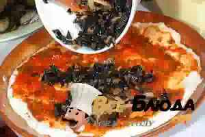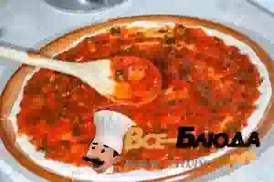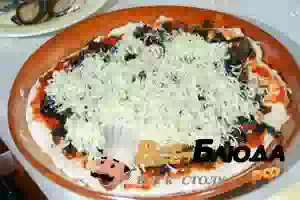 5. Пиццу обильно посыпать тертым сыром, который легко плавится. Выпекать пиццу при 200С примерно 10-15 минут. Подавать на стол в той же форме, в которой она запекалась.