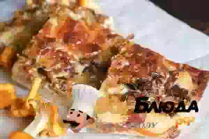 12. Щедро посыпать тертым пармезаном, а затем разложить кусочки моцареллы. Вернуть пиццу в духовку и запекать до готовности. Достать противень с пиццей, дать её остыть, а затем порезать на кусочки. Пицца на кефире с лисичками и беконом готова.