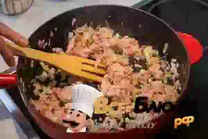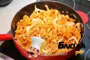 7. У бекону с луком добавить лисички и готовить до их полной готовности. Начинку посолить и поперчить по вкусу.