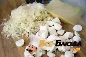 8. Пармезан натереть на мелкой терке, а моцареллу порезать небольшими кусочками.