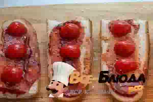 4. Помидоры черри вымыть, обтереть досуха бумажным полотенцем и разрезать пополам. Разложить половинки черри поверх соуса на багет.
