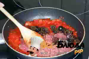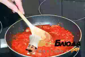 1. Приготовить тесто для пиццы по любому рецепту. Для начинки нагреть сковороду, добавить оливковое масло и пассеровать на нем тонко нарезанный лук и чеснок. Добавить помидоры и тушить около 5 минут, пока соус не загустеет.