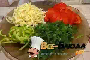 1. Подготовить начинку: тонко нарезать помидоры, нашинковать на полосочки перец, мелко порубить зелень, натереть на терке сыр.