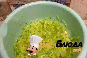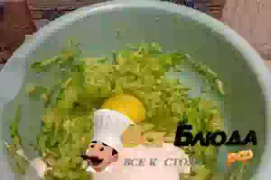 3. Очистить кабачок, вынуть из него семечки и натереть на терке. Добавить половину чайной ложки соли, перемешать и оставить на 10 минут. За это время из кабачка отделится лишняя жидкость, которую потом необходимо слить.