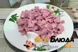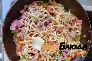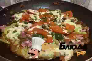 9. Теперь можно выкладывать начинку: дольки помидоров, перец, зелень, кубики колбасы и посыпать все сыром. Вновь закрыть сковороду крышкой и готовить пиццу еще 10 минут.