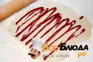 4. Моцареллу порезать тонкими пластинками и выложить на начинку. Затем посыпать тертым твердым сыром типа пармезана. Приподнять края прямоугольника, подвернуть их к центру прямоугольника и аккуратно свернуть рулет. Рулет должен быть неплотным, оборотов не больше 2-3. Переложить рулет с начинкой швом вниз на застеленный пекарской бумагой или смазанный растительным маслом противень.