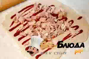 1. Для приготовления начинку куриную грудку натереть солью и молотым черным перцем, завернуть в фольгу и запекать до готовности в прогретой до 190С духовке. Подошедшее тесто для пиццы переложить на присыпанную мукой рабочую поверхность и разделить на 2 равные части. Каждую часть раскатать в прямоугольный пласт и слегка смазать готовым томатным соусом или кетчупом.