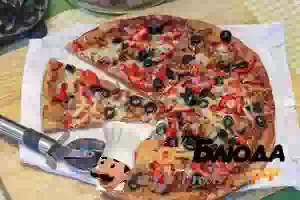 10. Поверх мясной части начинку разложить маслины и сладкий перец. Посыпать пиццу оставшимся сыром и отправить в разогретую до 200-220С духовку на 18-20 минут. Точное время выпечки пиццы зависит от вашей духовки и толщины теста. Готовую пиццу переложить на тарелку и подавать к столу. Пицца из ржаного теста с беконом, колбасным фаршем, маслинами и сладким перцем готова.