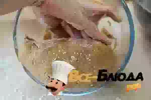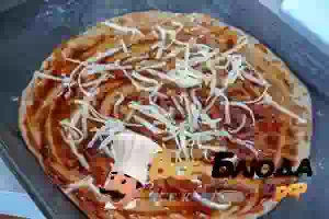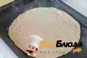 2. Тесто разделить на 2 равные части и каждую растянуть в тонкую лепешку диаметром 30 см прямо на припудренном мукой противне.