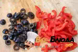 3. Подготовить все продукты для начинки. Сладкий перец очистить от семян и перегородок, нарезать тонкими полосками. Маслины нарезать колечками.
