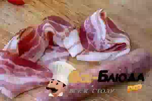 9. Между кусочками фарша уложить подкопченный бекон, который тоже надо разделить на несколько частей, отрывая по кусочку от тонких ломтиков.