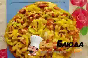 Пицца на сковороде с грибами, колбасой и сладким перцем