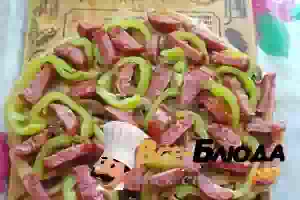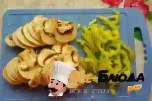 4. Пока готовится лепешка для пиццы, нарезать соломкой сладкий перец и колбасу. Шампиньоны протереть влажной салфеткой и нарезать пластинами.