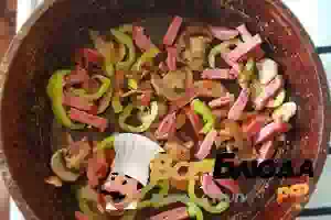 » » Пицца на сковороде с грибами, колбасой и сладким перцем