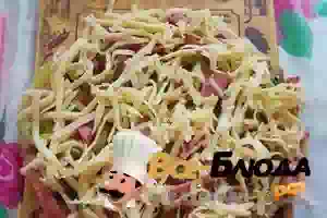 7. Затем остывшую основу из теста намазать кетчупом и майонезом. Распределить на неё грибы, перец, колбасу.