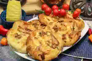 10. Противень с мини пиццами с копченой рыбой и жареным луком поставить в прогретую до 200-220С духовку на 15-20 минут. Готовую пиццу с копченой горбушей и сыром переложить с противня на тарелку и можно подавать на стол.