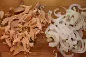 3. Репчатый лук порезать полукольцами. Копченую горбушу отделить от костей, затем мясо порезать или разобрать руками на небольшие кусочки.