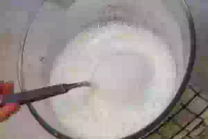Замесить мягкое тесто для пиццы на кефире. Налить в миску кефир, добавить соду и перемешать. Кефир вспенится, увеличится в объеме.