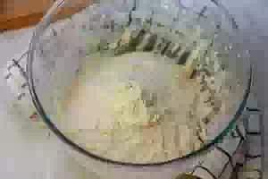 2. После этого добавить соль, сахар, яйцо. Снова размешать и подсыпать примерно половину просеянной муки. Размешать и по частям добавлять остальную муку.