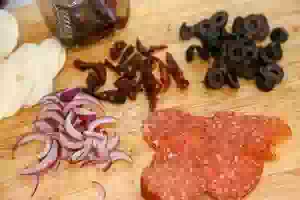 4. Для начинки колбасу пепперони нарезать тонкими кружочками. Вяленые помидоры в масле переложить на бумажную салфетку, а затем нарезать поменьше. То же самое проделать с маслинами. Лук нарезать тонкими четвертькольцами, залить кипятком, оставить на 5 минут, затем слить воду и обсушить на бумажных полотенцах. Сыр моцареллу для пиццы нарезать кружочками толщиной около 5 мм.