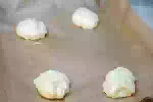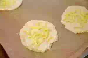 5. Противень смазать растительным маслом или сначала застелить пергаментной бумагой и смазать маслом. Столовой ложкой выкладывать тесто на противень. Затем тесто размазать ложкой, формирую из него круги диаметром 10-12 см и толщиной 5 мм. Ложку смачивать в растительном масле и разравнивать ею тесто.