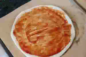 3. Щедро смазать лепешку готовым томатным соусом, оставляя края свободными.