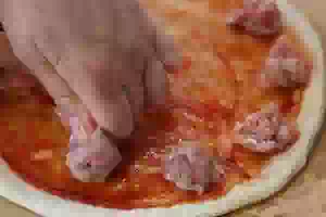 1. Замесить тесто для пиццы по вашему любимому рецепту или использовать наш проверенный рецепт. Готовое тесто после расстойки разделить на 2-3 равные части и каждую скатать в шар. Поставить противень в духовку, включить максимальный разогрев (220-250С).