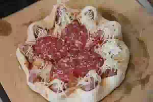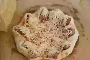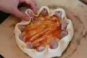 5. Теперь надо смазать холодной водой самый край пиццы и, приподнимая края, оборачивать тестом кусочки фарша.