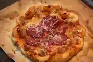 7. На сыр разложить тонкие ломтики копченой колбасы. Перенести пиццу на бумаге на разогретый противень. Противень с пиццей поставить в нижнюю часть духовки и печь примерно 20 минут.