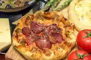 8. За это время пицца подрумянится, пропечется. Можно дополнительно посыпать слоем тертого сыра и поставить на 1-2 минуты под гриль, чтобы сыр расплавился. Готовую мясную пиццу с мясным бортом переложить с противня на блюдо и сразу подавать на стол.