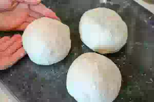 1. Замесить тесто для пиццы по вашему любимому рецепту или использовать наш проверенный рецепт. Готовое тесто после расстойки разделить на 2-3 равные части и каждую скатать в шар. Поставить противень в духовку, включить максимальный разогрев (220-250С).