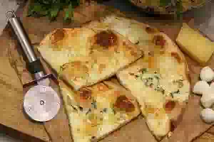 5. Перенести пиццу на бумаге на разогретый противень. Противень с пиццей поставить в нижнюю часть духовки и печь примерно 20 минут. За это время сыры расплавятся, а края пиццы подрумянятся и на них появятся аппетитные пузыри. Готовую пиццу 4 сыра переложить с противня на блюдо и сразу подавать на стол.