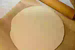 2. Переложить шар из теста на припудренную мукой рабочую поверхность. Оставшееся тесто прикрыть полотенцем, чтобы оно не подсыхало. Сначала растянуть, а затем раскатать тесто в лепешку толщиной около 5 мм и переложить на бумагу для выпечки. Это делается для того, чтобы было проще перенести пиццу с начинками на горячий противень.